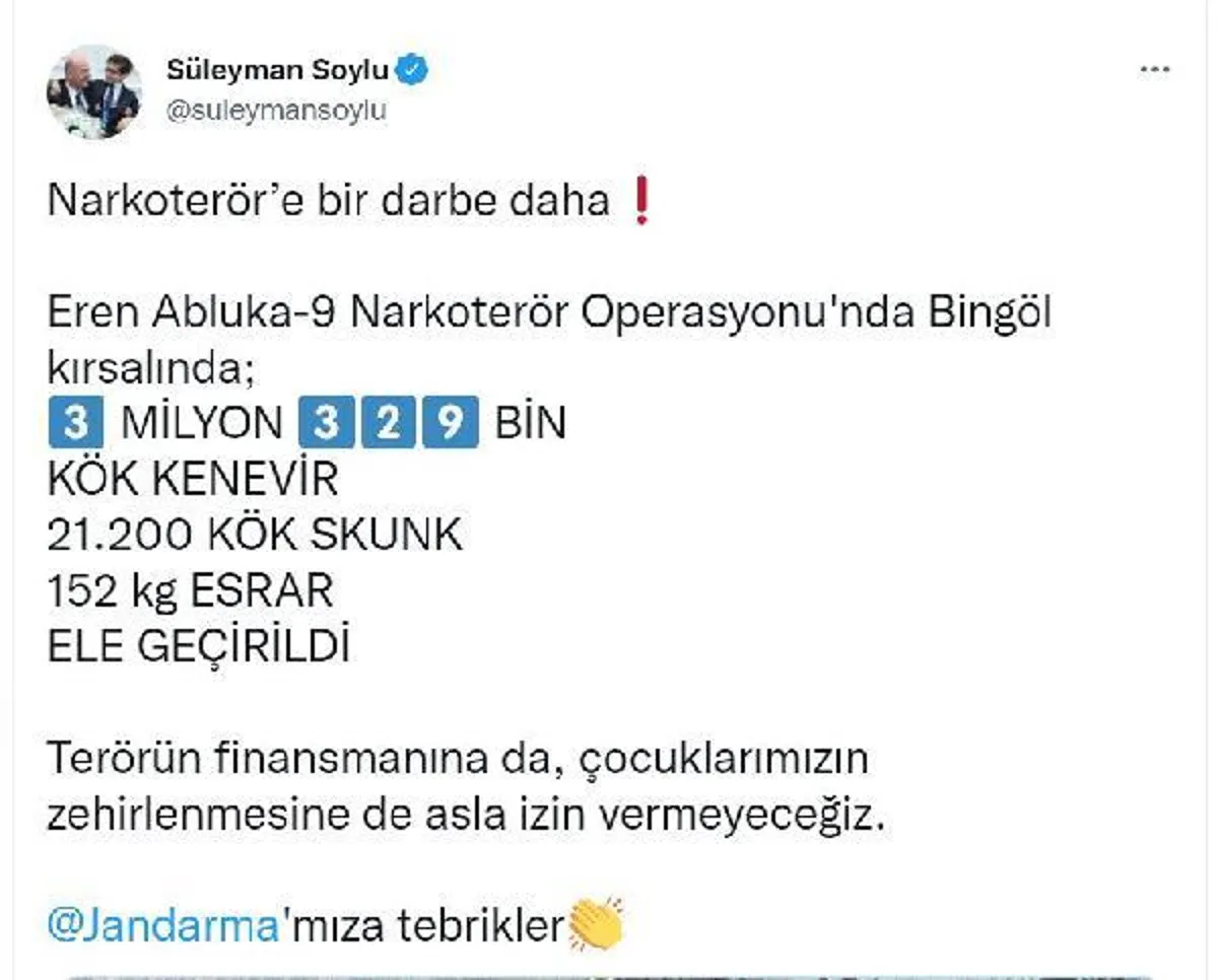 İÇİŞLERİ Bakanı Süleyman Soylu, Bingöl kırsalında 3 milyon 329 bin kök kenevir, 21 bin 200 kök skunk ve 152 kilo esrar ele geçirildiğini açıkladı. Bakan Soylu, Twitter’daki hesabından yap...